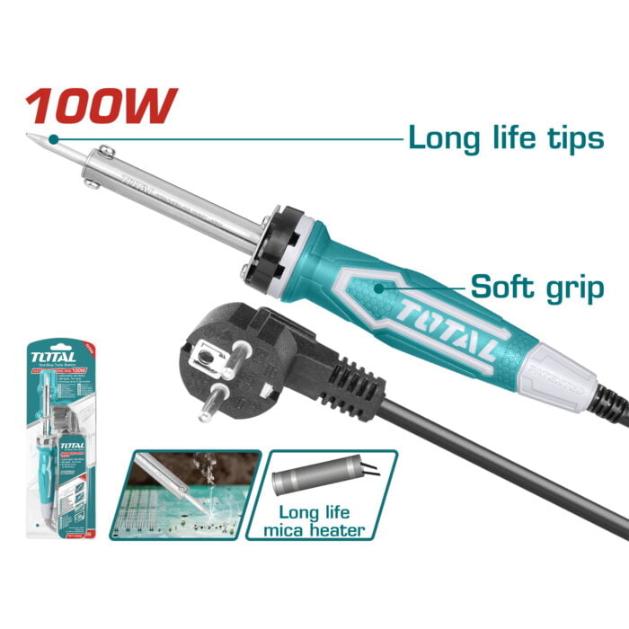 Az elektromos forrasztó TOTAL TET10006 egyedi eszköz, amelyet forrasztásra és forrasztásra használnak. A részek felmelegítésére, a forraszoló anyag megolvasztására és a forrasztó felszívására használják a csatlakoztatott alkatrészekre.